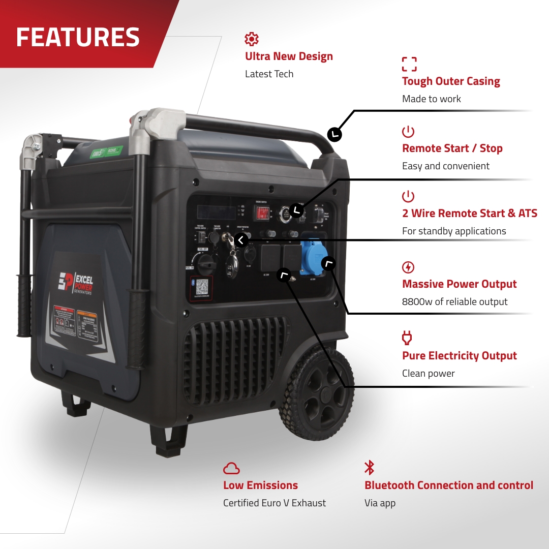 The Excel Power XL10000i is a powerful 8.8kW petrol inverter generator built for professional work, catering trucks, and home backup use.