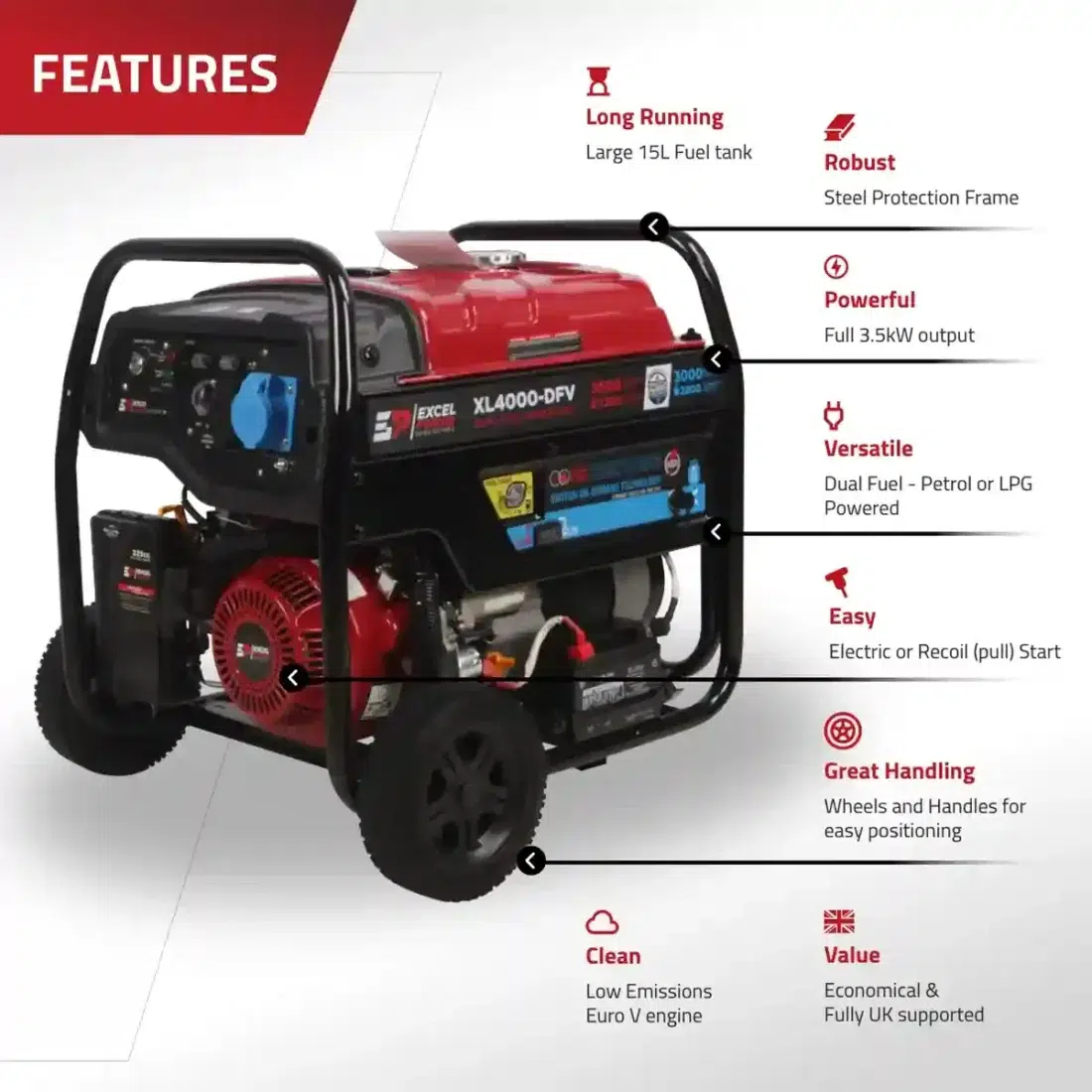 The Excel Power XL4000DFV is a versatile 3.5kW dual-fuel petrol/LPG open frame generator built for medium-duty professional work, home, and outdoor applications.